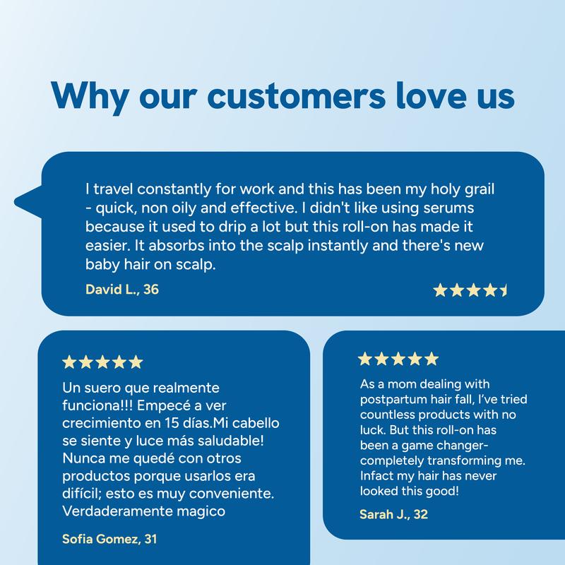 Leo S. June 2025Verified Buyer"Thicker Hair in Just One Month!""I was skeptical at first, but after using this serum for about 4 weeks, I’m truly amazed by the results. My hair feels thicker, and the bald spots near my hairline have started to fill in with fine new hairs. The formula is lightweight, and I love the fresh scent. I’ll definitely be repurchasing!"